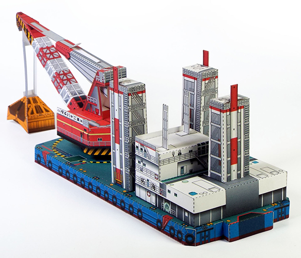 タチバナ工業株式会社様のご依頼により、同社様の30㎥全旋回式ハイブリッドグラブ浚渫船兼起重機船「拓海」のペーパークラフトを設計いたしました。